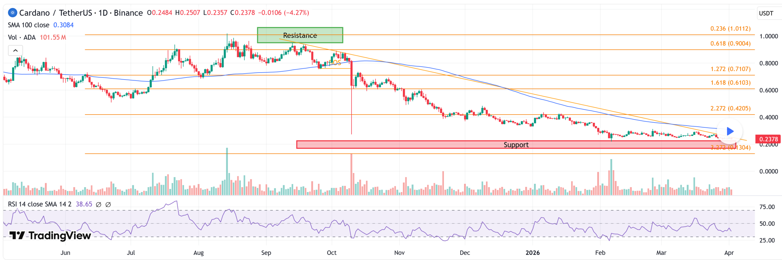 A break above the descending trendline from there would put $1.01 back in view, a level that lines up with the 0.236 Fibonacci retracement. This would represent a 304% gain from where ADA trades today. If $0.13 gives way, the outlook deteriorates, and deeper losses become more likely.