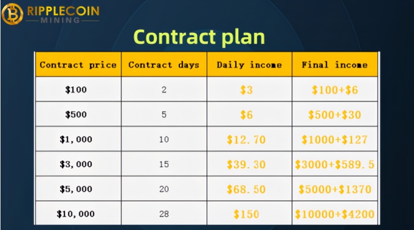 For more contract plans, please log in to the official website of the Ripple Mining Platform.