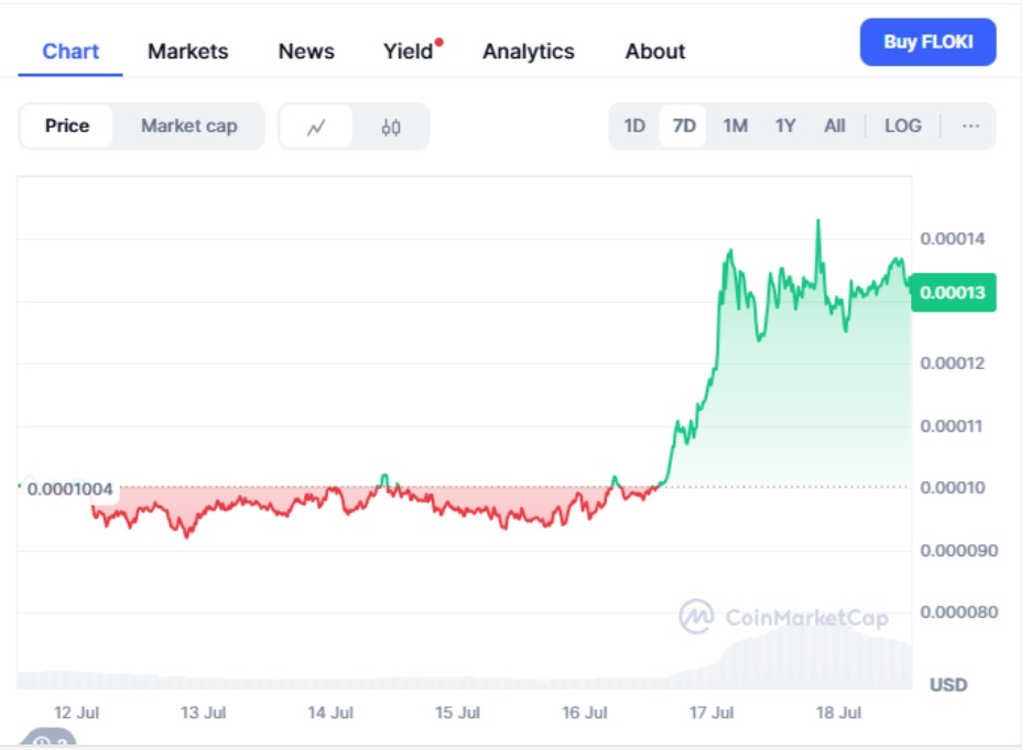 FLOKI is currently trading at $0.000132 with over $573 million in 24-hour volume.
