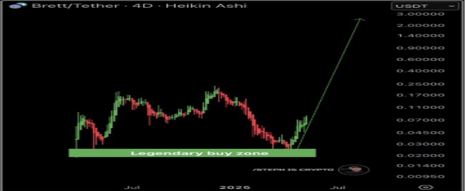 Brett (BRETT) is making waves, rebounding strongly from what crypto influencers have dubbed the “Legendary Buy Zone.” After a prolonged consolidation and downward pressure, Brett (BRETT) has shown renewed strength on the 4-day Heikin Ashi chart, sparking a wave of bullish sentiment across the crypto community.