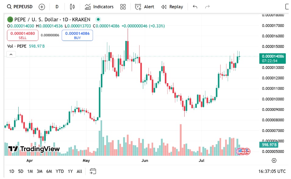 While that was happening, PEPE Coin settled back a bit, down 2.19% to $0.00001406 — but its trading volume exploded more than 50% to $1.84 billion. That suggests whales and retail investors are still playing. Some traders believe PEPE can be the next 100x crypto if meme strength holds up.