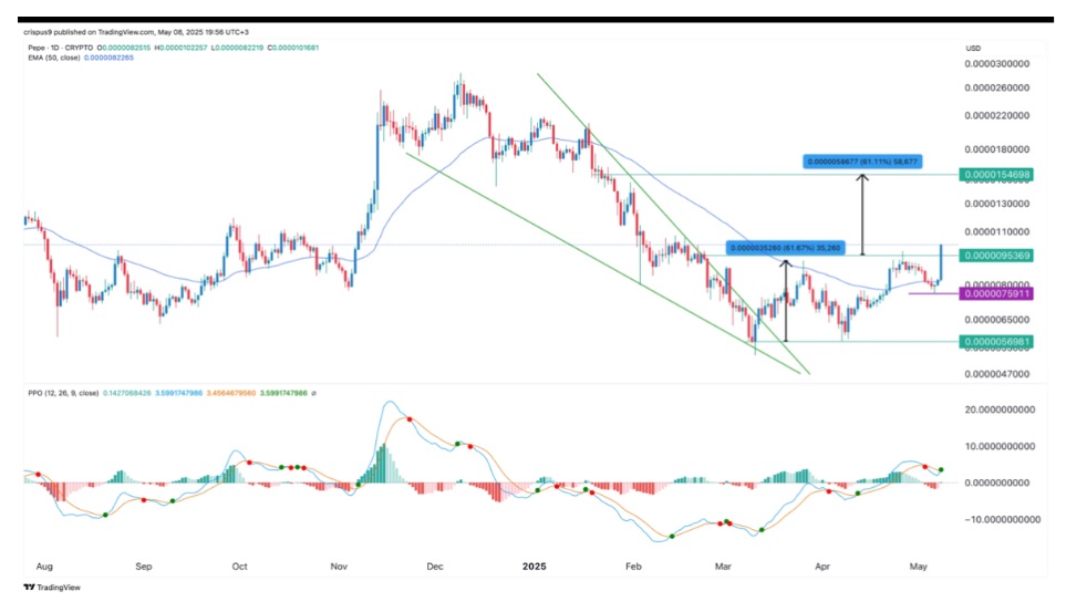 Pepe recently surged to $0.000010, its highest level since February, climbing 65% from its yearly low. Trading volume exploded by 140% to $1.2 billion overtaking meme coins like Shiba Inu, Bonk, and Floki. This rise came as investor sentiment turned bullish, with Bitcoin crossing $100,000 and the overall crypto market shifting into “greed” mode.