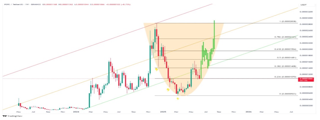 An analyst has drawn attention to a classic cup-shaped recovery pattern forming on the Pepe (PEPE) weekly chart. This rounded structure suggests a strong base-building phase, with the price of Pepe (PEPE) recently surging.