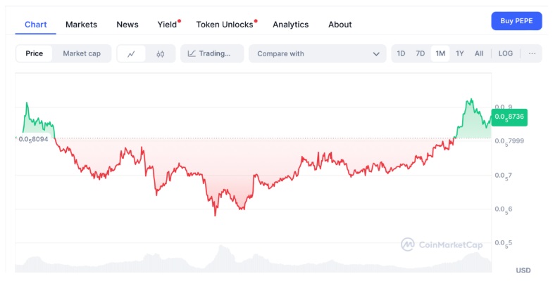 Pepe Coin (PEPE) is showing renewed strength, with a 17% price increase pushing it closer to the $0.0000090 resistance level.