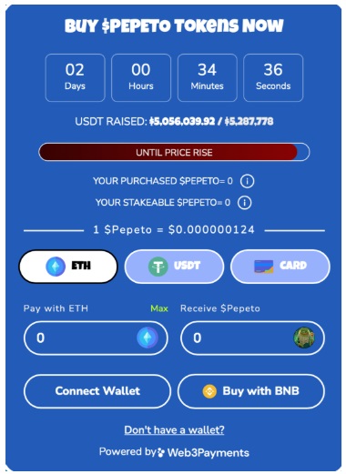 The presale is still live on the official website, where $PEPETO is available at $0.000000124. Accepted payment methods include USDT, ETH, BNB, and card.