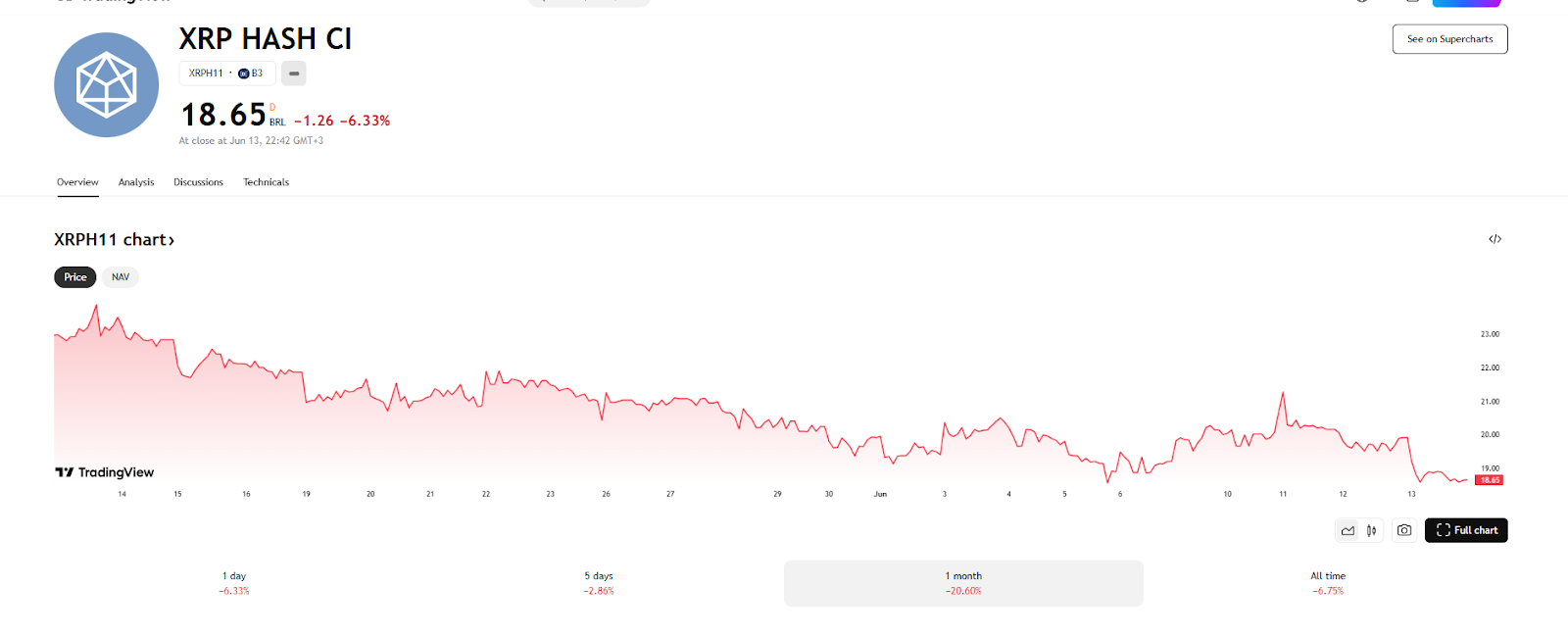 As of June 13, XRPH11 ended trading at 18.65 BRL, approximately $3.37. This marked a 6.33% daily loss and a 6.75% drop from the fund’s highest recorded price. Over the past 30 days, the product has declined by 20.6%, despite initial enthusiasm surrounding its late-April launch
