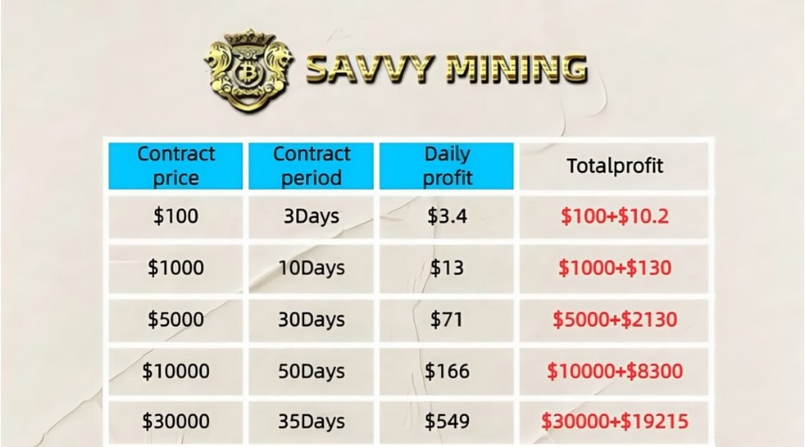 SAVVY MINING offers a variety of efficient mining contract plans: contract prices range from $100 to $200,000, and each package has different terms and benefits. For example: