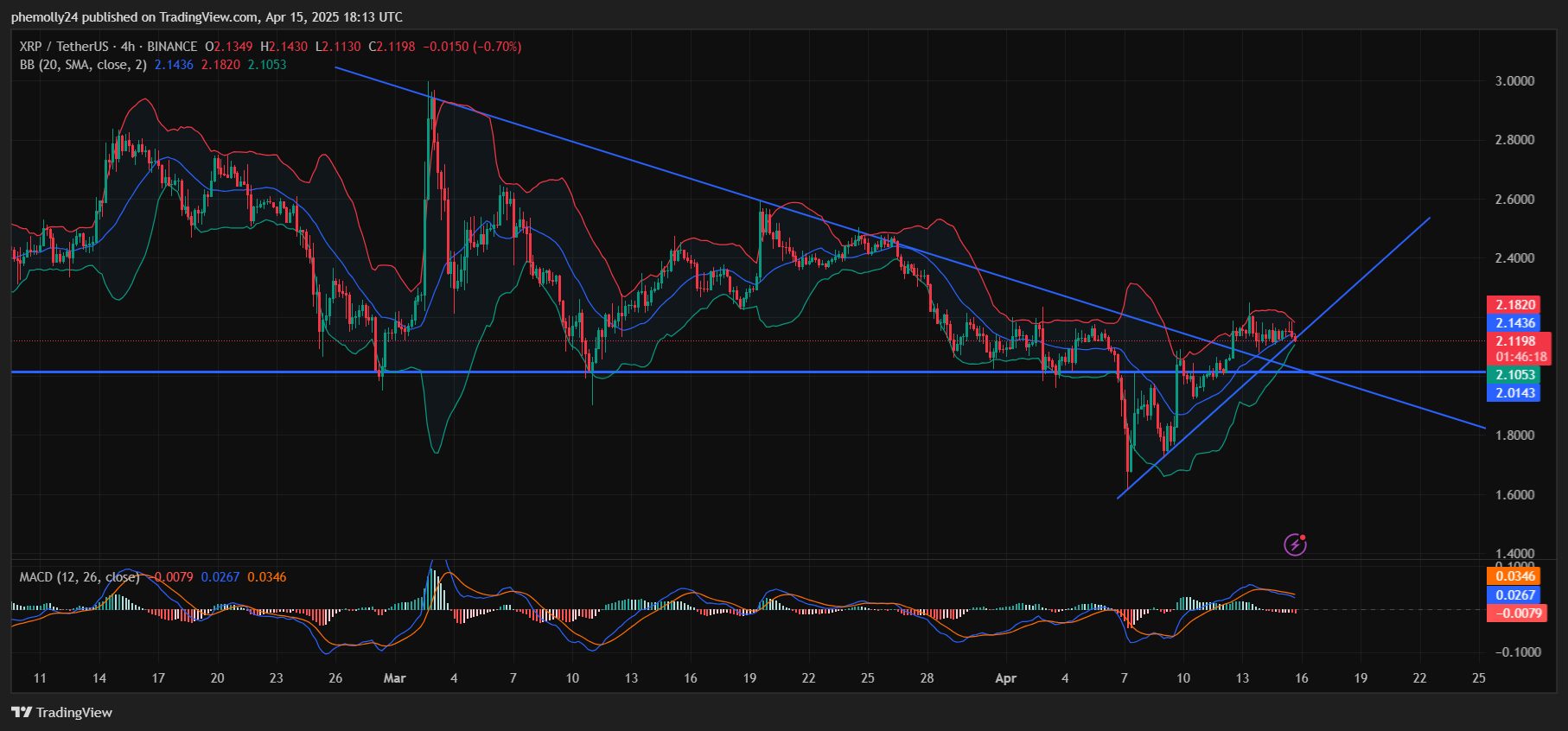 XRP is currently forming a textbook ascending triangle pattern, where a rising trend line compresses price against horizontal resistance. This is a bullish formation that signals accumulation. While trading volume has slightly declined—often typical before breakout events—the setup suggests price could soon erupt. If XRP breaches the $2.18 resistance with strong volume, a measured move points toward the $2.40 to $2.60 range. If resistance holds, however, XRP may revisit lower support zones, particularly around $2.01.